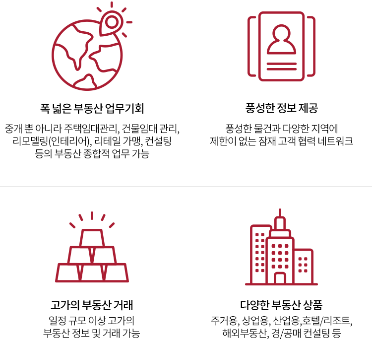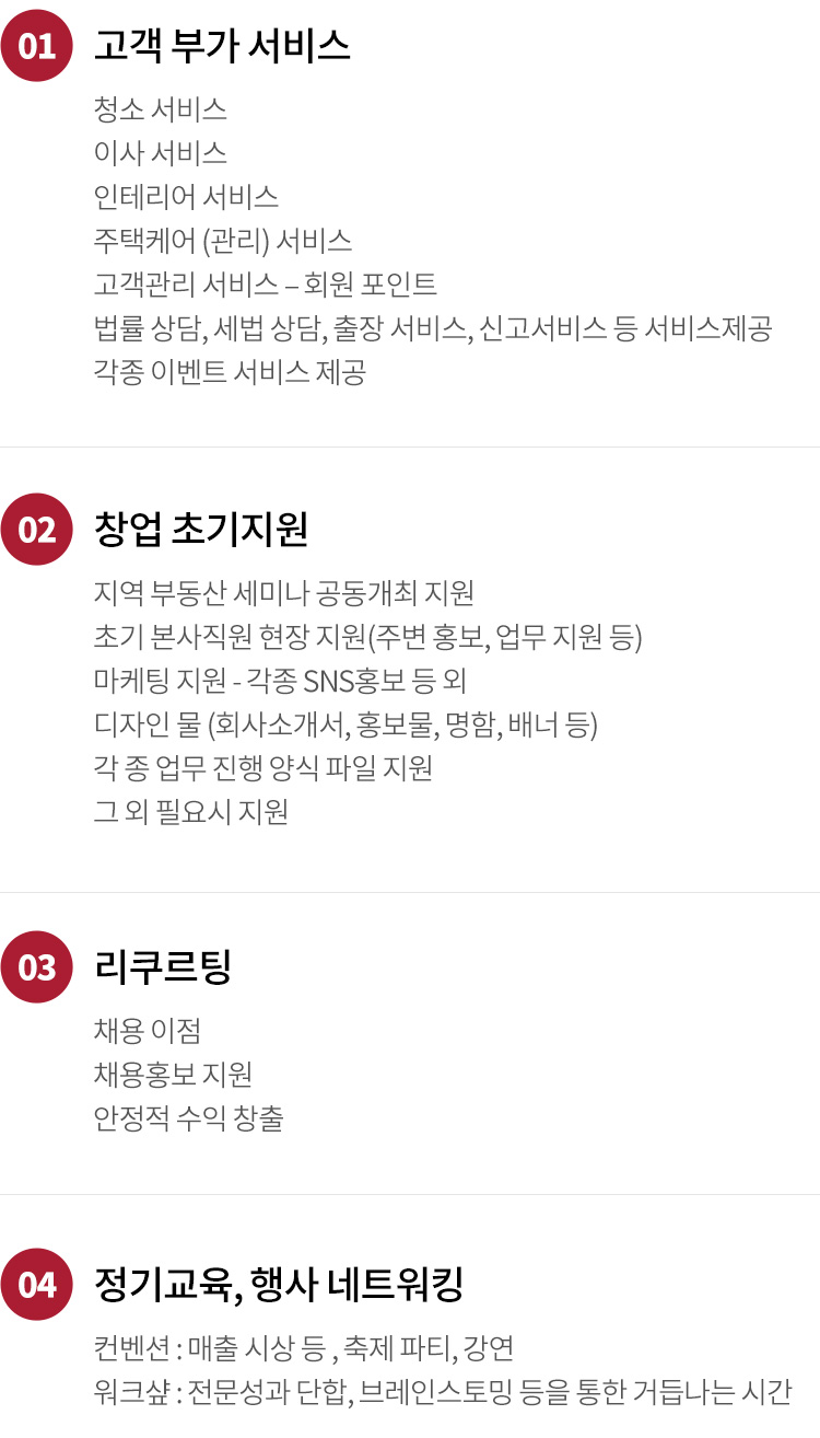 부동산 거래 고객이 공인중개사에게 원하는 것과 창업 공인중개사가 필요로 하는 것을 해결해 주는 가치를 제공함으로 저비용 고효율의 결과를 창출하여 소비자, 중개사, 회사, 국가 모두가 이득이 되는 비즈니스입니다.